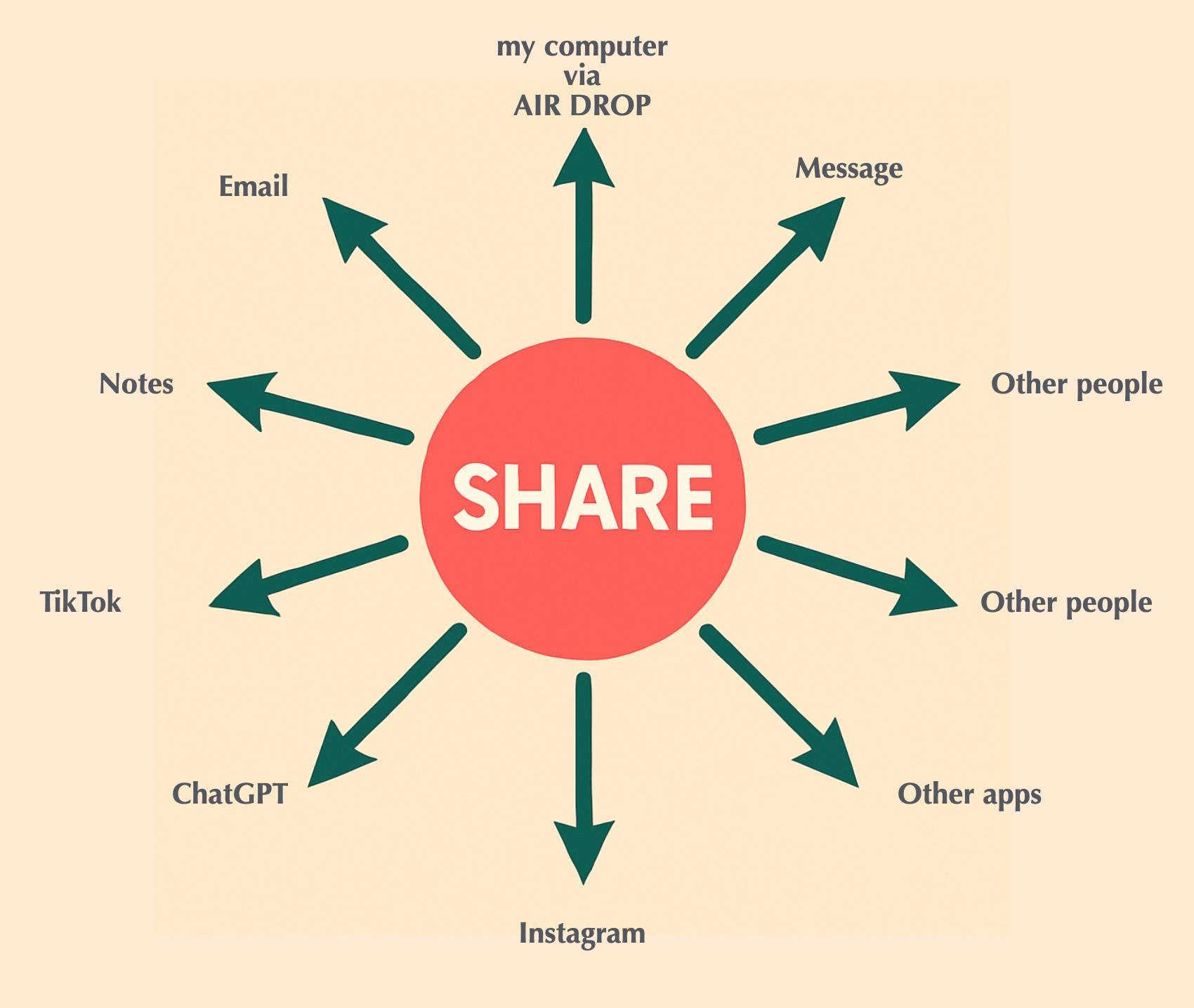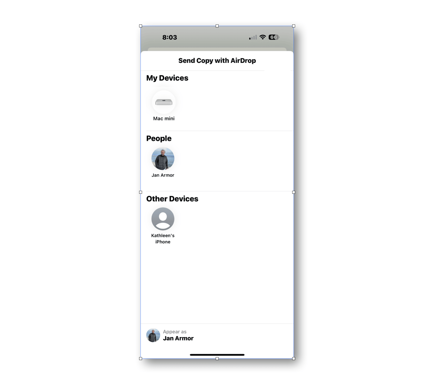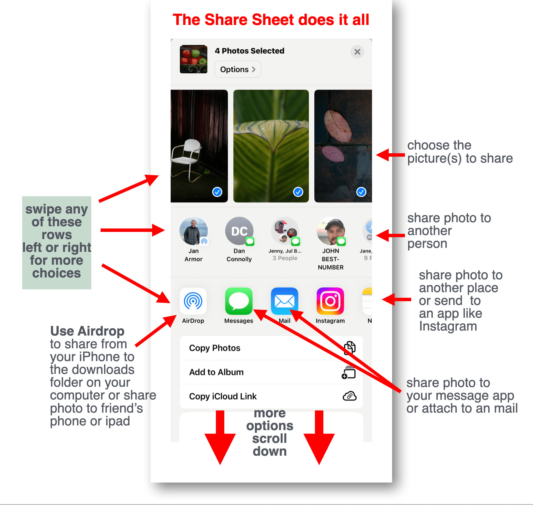 Ways to ShareSharing pictures on an iPhone is a lot different than sharing an ice cream cone, and not as much fun. That said, learning how to do this comes in pretty handy. Sharing photos was one of the challenges I faced when moving into digital photography. In the real world I could just hand my picture to someone I wanted to share it with, or mail it to them. Here, on my iPhone, sure, I could pass the iPhone over to them to have a look but how to get the image from my phone to theirs? And how to get the photo into another app like SnapSeed for processing? These were the questions: How to move pictures from here to there? Below are some suggestions on how to do it... Use The Share SheetAs you scroll through your pictures in your Photos library notice the funny little icon at the lower left of the screen when you enlarge the picture, when you are holding the phone in the portrait orientation. It looks like this. It is called the "share sheet". When you have found the picture you wish to share, just tap on it. Tap on this innocent looking icon to share (send) your photos or documents to other places. You are immediately brought to a new and very powerful new "Share Sheet" screen. Notice your picture has been reduce to a thumbnail and it has a blue check on it. Now you can also check other pictures you may wish to send as well. You can swipe both left and right to see and select more pictures you may wish to share at the same time. Go ahead, check several more to add to the first one, like I did here. Before you share it, let's us look at the Share Sheet more closely. There's way more features here than at first meets the eye. Notice, in the second row you will find thumbnails of some of your favorite people to share with. You can tap on the thumbnail of someone who you wish to receive your picture(s). The third row contains apps you may want to use with the picture, like include in a text message or attach to an email. Swipe along this row to find many more apps you may wish to use. At the very end of this third row you will find three dots with the word "more" underneath. Tap it and you will find a long list of even more apps you may wish to use with your picture. Wait, there's even more features on this sheet. Swipe up and you will see a long list of other possible things you may want to do your photograph. As you use the Share Sheet you will come appreciate its power and convenience! Think of your Share Sheet as your hub or Grand Central Station.I want to give a special shout out to "AirDrop" because it is the one feature that I use a lot. Tap on it and you will be presented with a new screen that offers other places where you can send your picture IF there is another open device nearby, turned on and available, like your computer, for example. (AirDrop doesn't work if your computer is asleep.) If I have a picture on my iPhone that I want to use in a Keynote slide show, I just AirDrop it to my Mac mini computer from my iPhone. See below. Another screen appears. I just tap on the Mac mini circle that represents my computer. Instantly the picture is sent to my documents folder on my computer where I can drag it right onto the slide show. So fast, so easy.. By the way, you can also AirDrop a photo right into another person's Apple library IF they have given you permission to do so. The recipient must go to Settings>General>AirDrop and check ""Everyone for 10 Minutes". This means that the person is giving you permission to receive the picture. You have just 10 minutes to send it, after which permission expires. (This feature is a good one. It prevents a stranger in the coffee shop from sending you an unwanted picture without your permission.) Furthermore, when the recipient receives the sent photo, a box appears asking if they will "accept" it. In the example below, Jan Armor will send a picture from his iPhone to his computer, Mac mini, when he taps the circle so labeled. Also notice, Jan Armor could also send that same picture to Kathleen's iPhone just by tapping on her circle. Pretty slick! This AirDrop is very useful trick to learn. Not only can you send pictures from your phone, you can also send documents. AirDrop works on the computer too, AirDropping photos from the computer to your phone or your iPad, as well as to someone In the room who has given you permission. Lastly, AirDrop has a range of about 30 feet. Click here for a helpful video that explains using the Share Sheet (on an iPad). (Although this video is for iPad users it is a very good explanation for iPhone and Macusers as well.)